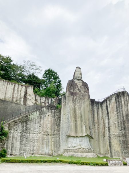 宇都宮市の西部、大谷地区は大谷石の産地として広く知られています。石を切り出した巨大な岩壁に囲まれるようにして建つのが、高さ27メートルの「大谷平和観音」です。戦後間もない1954年、戦争で犠牲となった人びとの冥福と平和を祈念して、地元の石工たちの手により彫り上げられました。その姿は観音菩薩が静かに手を合わせ、人々の平安を祈っているように見えます。