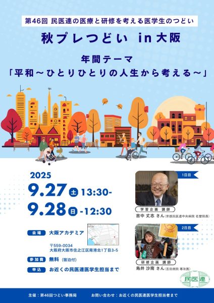 2025年9月27日・28日、全日本民医連主催の「第46回 医学生のつどい 秋プレつどい」が大阪アカデミアで開催されました。