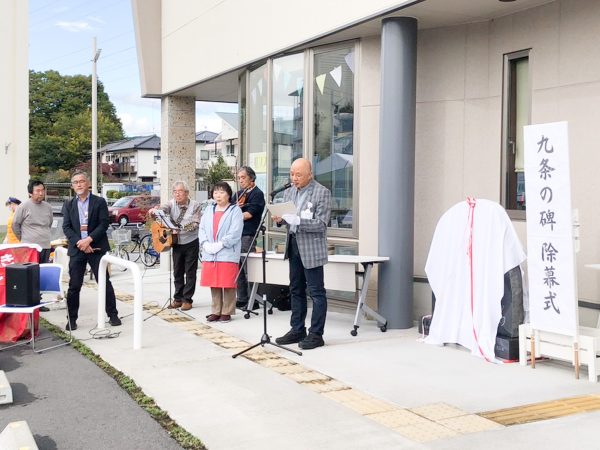 関口理事長の言葉に続き、関口理事長と虹フェス実行委員長・鈴木順子さんによって除幕が行われました。白布が取り払われると、黒御影石に刻まれた「九条の碑」が静かに姿を現し、会場からは大きな拍手が起こりました。