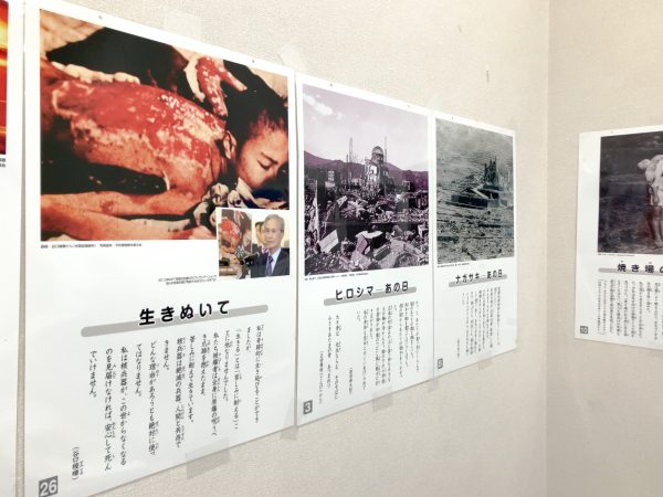 会場には多くの参加者が集まり、壁面には「原爆の絵」や第五福竜丸などの