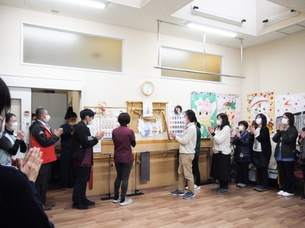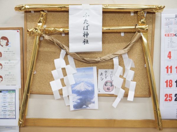 (ふたば診療所内 デイルームに設置されたふたば神社をみんなで参拝)